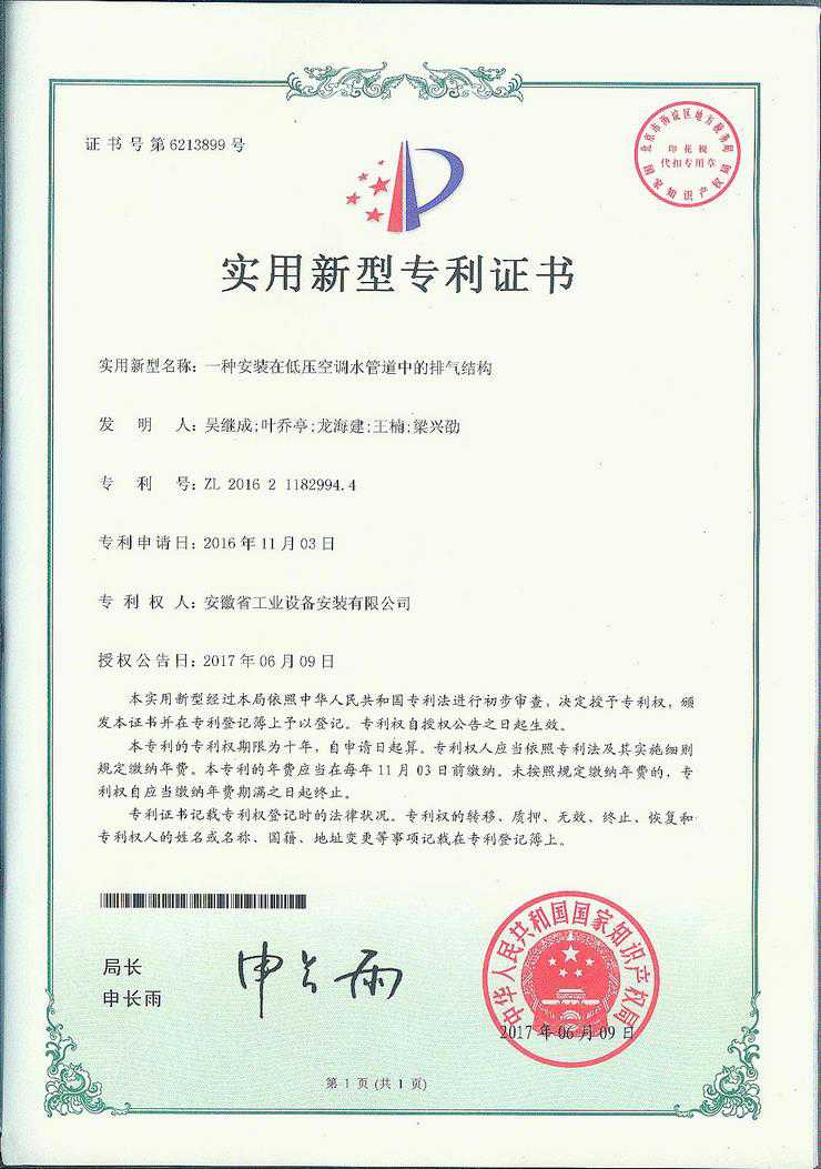 近日,由安徽安裝公司申報的《一種安裝在低壓空調水管道中的排氣結構 》實(shí)用新型項目,正式獲得國家知識產(chǎn)權局授權,并頒發(fā)了實(shí)用新型專(zhuān)利證書(shū)(專(zhuān)利號:ZL201621182994.4)。這是繼《一種便攜式施工現場(chǎng)臨時(shí)用電聯(lián)排插座》之后獲得的第二項專(zhuān)利。