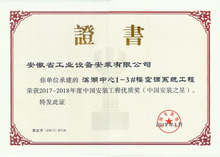 2019年4月17日,中國安裝協(xié)會(huì )在珠海召開(kāi)第六屆七次理事(擴大)會(huì )議暨工程創(chuàng )優(yōu)經(jīng)驗交流會(huì ),會(huì )上表彰了2017-2018年度中國安裝工程優(yōu)質(zhì)獎(中國安裝之星),安徽安裝承建的“合肥市濱湖中心1#-3#樓空調系統工程”項目榮獲該項榮譽(yù)。