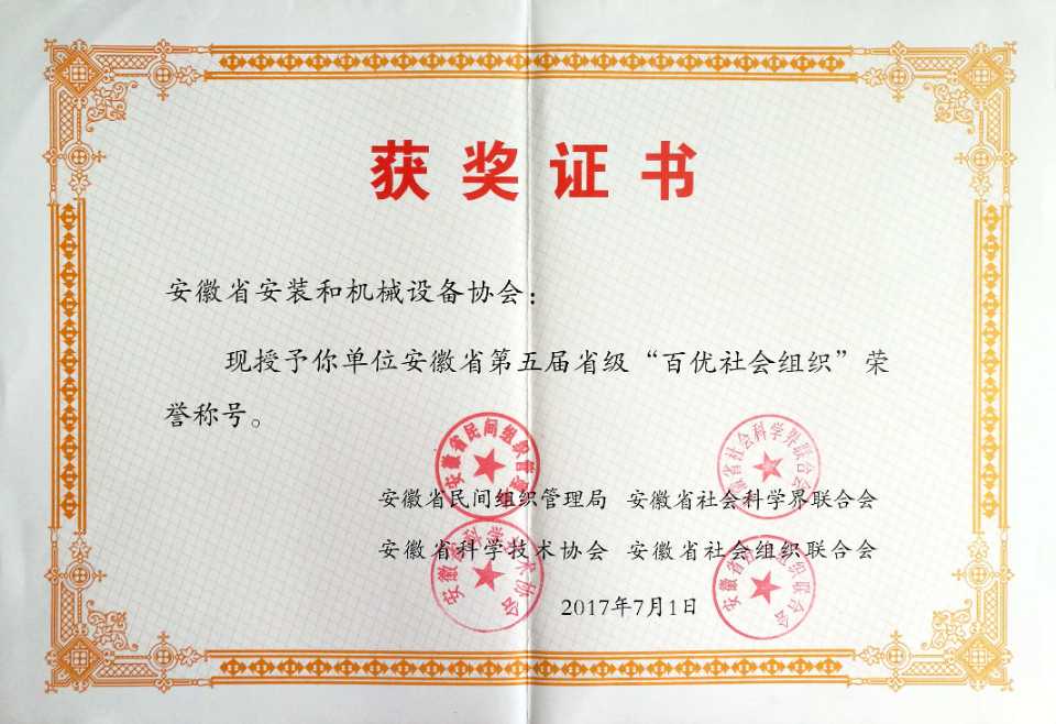 2017年7月,安徽省安裝和機械設備協(xié)會(huì )第三次榮獲安徽省第五屆省級“百優(yōu)社會(huì )組織”稱(chēng)號,并由安徽省民間組織管理局、安徽省社會(huì )科學(xué)界聯(lián)合會(huì )、安徽省科學(xué)技術(shù)協(xié)會(huì )、安徽省社會(huì )組織聯(lián)合會(huì )聯(lián)合頒發(fā)了榮譽(yù)證書(shū)。