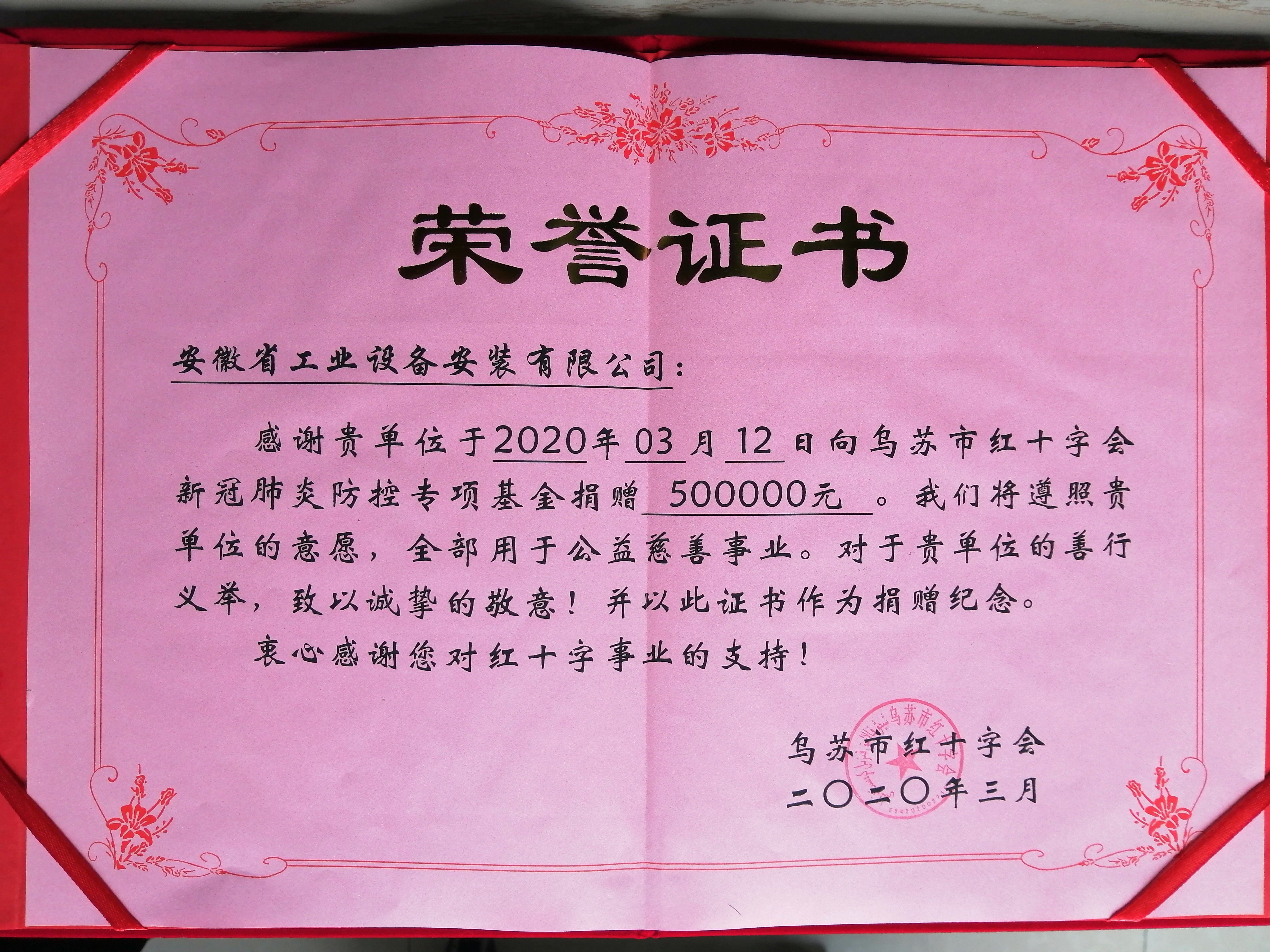 3月12日,安徽安裝公司向新疆烏蘇市紅十字會(huì )捐款50萬(wàn)元,助力打贏(yíng)疫情防控阻擊戰。