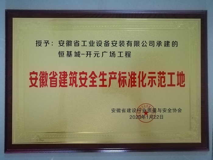 近日,安徽安裝承建的淮北恒基城開(kāi)元廣場(chǎng)項目榮獲“安徽省建筑安全生產(chǎn)標準化示范工地”稱(chēng)號,為公司在安全生產(chǎn)方面樹(shù)立了良好的企業(yè)形象。