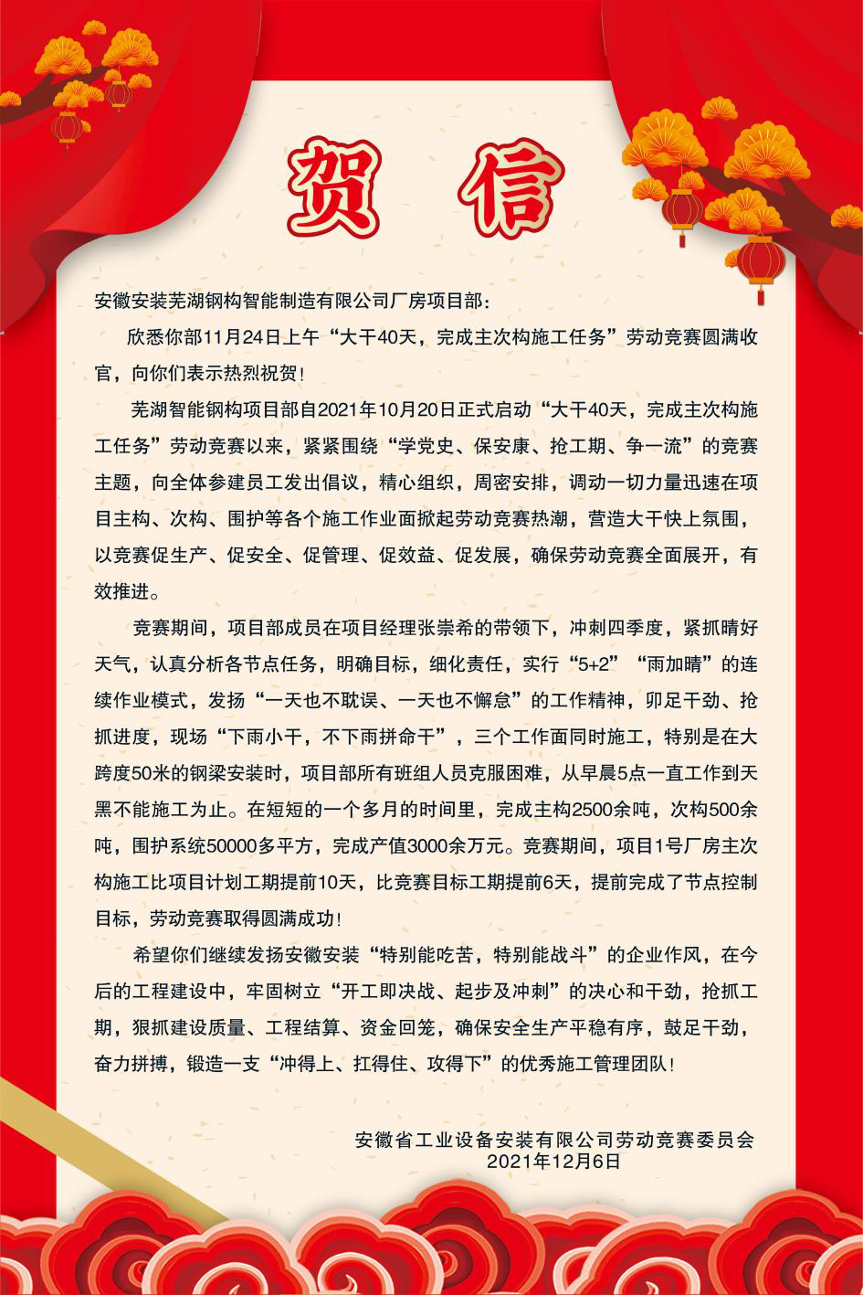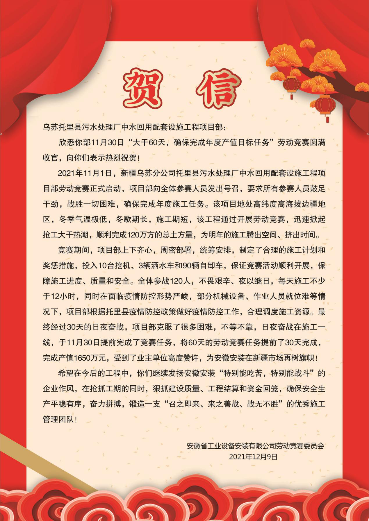近日,公司勞動(dòng)競賽委員會(huì )向蕪湖鋼構智能制造有限公司廠(chǎng)房鋼結構項目部和新疆托里縣污水處理廠(chǎng)中水回用配套設施工程項目部發(fā)出賀信,祝賀兩項目部勞動(dòng)競賽圓滿(mǎn)完成!