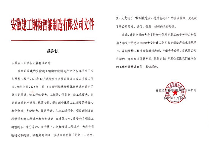 公司安徽建工鋼構智能制造有限公司廠(chǎng)房鋼結構工程項目收到業(yè)主單位感謝信
