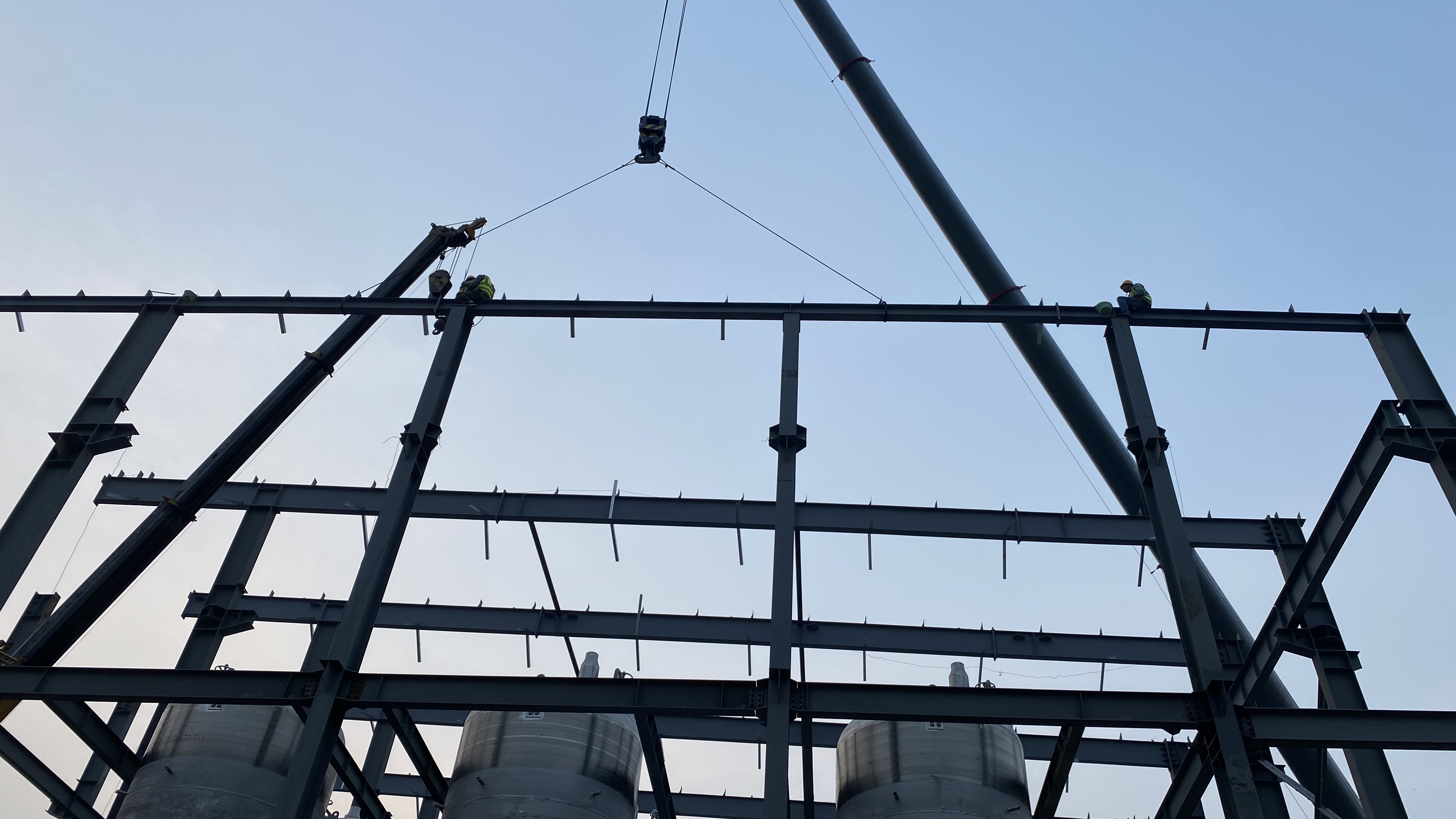 發(fā)酵車(chē)間吊車(chē)大臂高展,C區鋼結構工程鋼梁安裝正在進(jìn)行,司索工鋼梁綁扎穩固后,現場(chǎng)信號工發(fā)出清晰信號,經(jīng)驗豐富的司機操控著(zhù)吊車(chē)將鋼梁緩緩升起,20米的高空上,兩名安全防護的工人等待著(zhù)鋼梁靠近,停穩、就位、穩固、矯正、固定...一道道鋼梁就這樣架起,發(fā)酵車(chē)間的金屬骨架就這樣拔地而起,逐步形成。