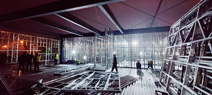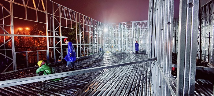 自11月初接到項目任務(wù)以來(lái),面對一個(gè)月完成三層結構方艙醫院主體機構、內部安裝、室外裝飾的極限工期,安徽安裝公司高度重視、精心組織、科學(xué)安排、迎難而上,全力以赴加快工程建設,期間,公司領(lǐng)導多次前往項目現場(chǎng)幫助協(xié)調解決工程施工中的難點(diǎn)、困難,為項目人員鼓勁加油;公司相關(guān)部門(mén)負責人駐扎項目一線(xiàn),指導協(xié)調內部流程、現場(chǎng)施工、外部對接、質(zhì)量安全等一應事務(wù);分公司第一時(shí)間組織精干力量進(jìn)入項目現場(chǎng),梳理現場(chǎng)情況,核對圖紙清單,進(jìn)行施工準備。從公司領(lǐng)導到項目一線(xiàn),安徽安裝公司自上而下以高度的使命感和責任感,投入到緊張的工程建設中去。項目管理人員披星戴月,從早上到夜間駐守在項目一線(xiàn),每日召開(kāi)工程會(huì )議,討論施工工作進(jìn)展,制定下一步工作計劃,安排交叉作業(yè)工序。為保障夜間施工安全,項目部安排兩名安全員輪流值守項目現場(chǎng),夜間在項目現場(chǎng)不斷巡查確保施工安全、高效開(kāi)展。