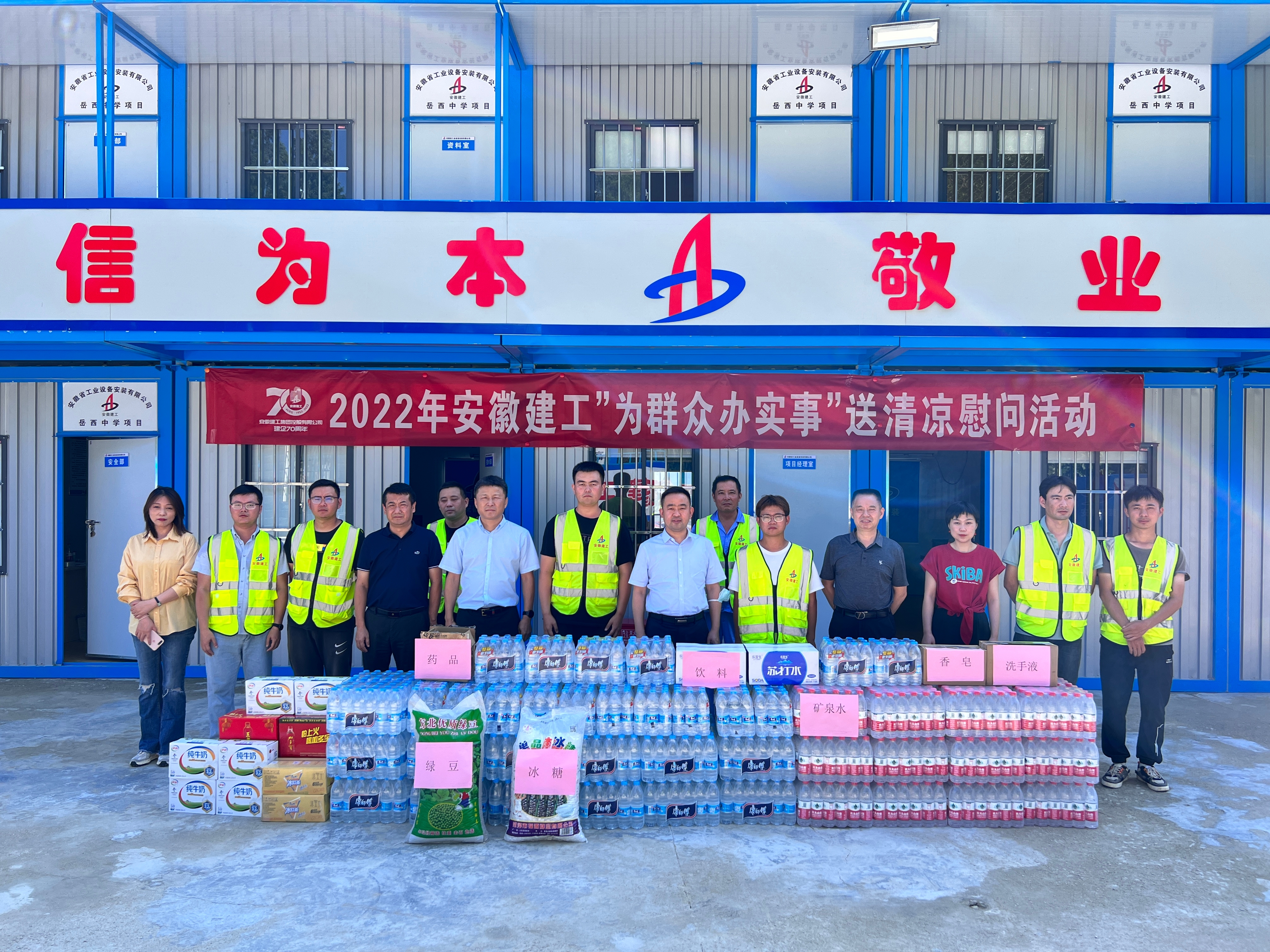 7月15日,建工股份黨委委員、副總經(jīng)理黃代赴安徽安裝岳西中學(xué)建設項目宣貫建工控股第一次黨代會(huì )精神暨開(kāi)展“為群眾辦實(shí)事”送清涼慰問(wèn)活動(dòng),安徽安裝公司黨委書(shū)記、董事長(cháng)胡六中參加慰問(wèn)。