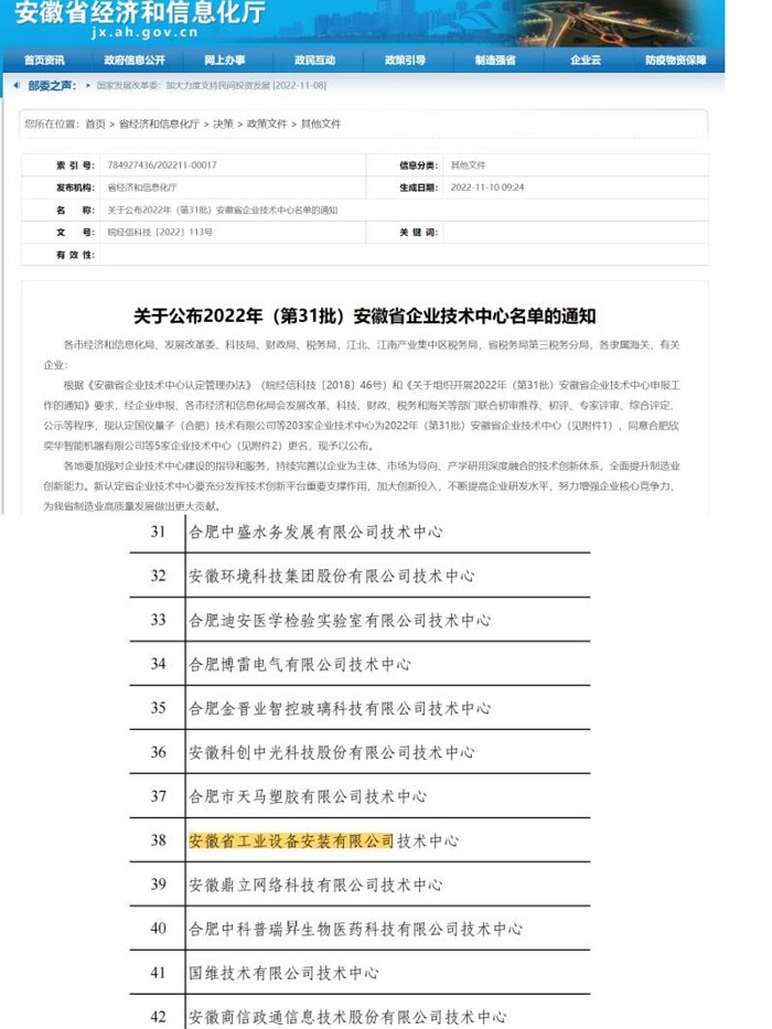 近期,經(jīng)企業(yè)申報,各市經(jīng)濟和信息化局、發(fā)展改革委、科技局、財政局、稅務(wù)局和海關(guān)等部門(mén)聯(lián)合初審推薦、初評、專(zhuān)家評審、綜合評定、公示等程序,安徽省工業(yè)設備安裝有限公司技術(shù)中心順利通過(guò)“安徽省省級企業(yè)技術(shù)中心”認定。