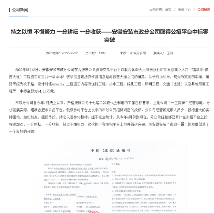 開(kāi)拓市場(chǎng)取得突破。今年以來(lái),分公司積極采取參與集團內部產(chǎn)業(yè)鏈專(zhuān)業(yè)分包競標和外部公招項目投標雙向并舉的方式拓展市場(chǎng),打開(kāi)經(jīng)營(yíng)局面,連續承接了蜀山區體育公園項目安裝工程等多個(gè)項目。同時(shí)積極參與合肥市公招平臺投標,8月份一舉中標廬江縣新建立人路(福泉路-城西大道)工程施工項目,中標金額3274.17萬(wàn)元,取得公招投標零的突破。