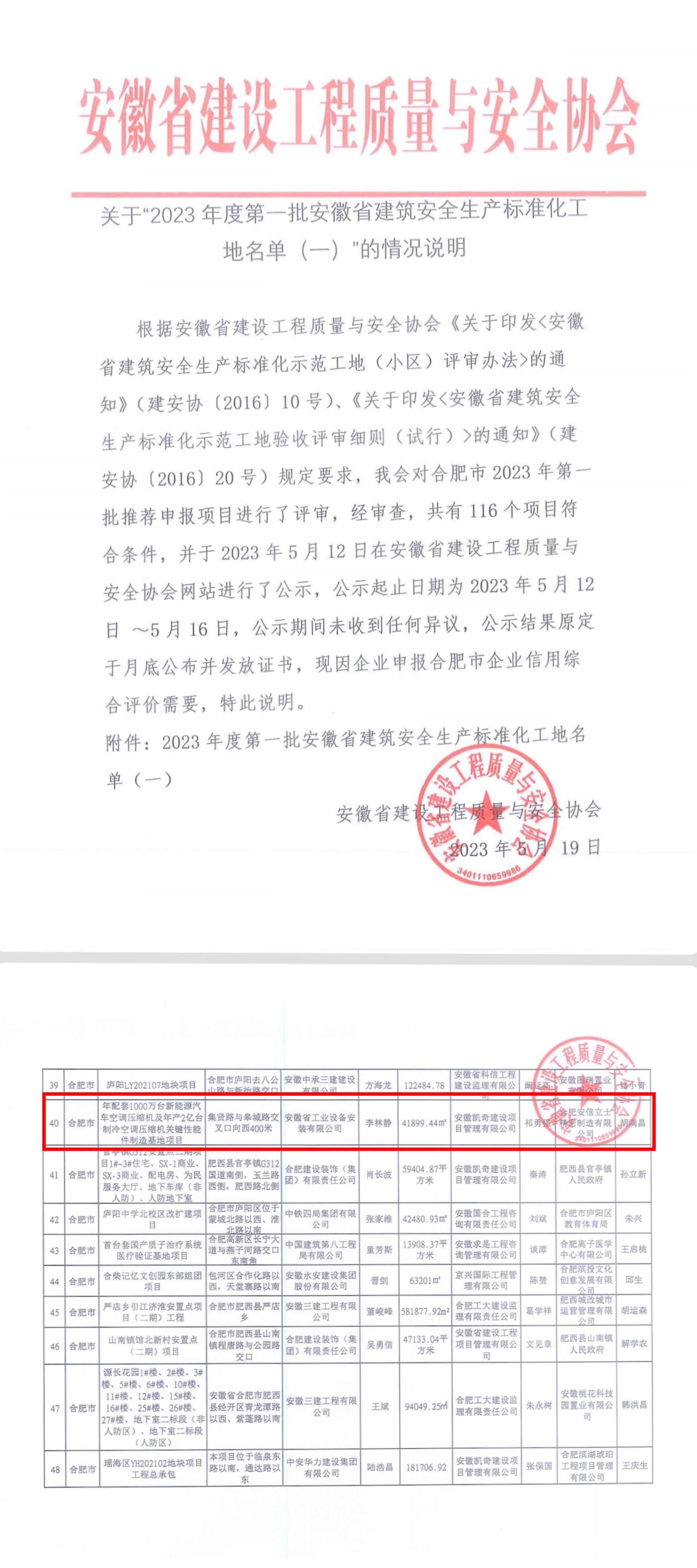 近日,安徽安裝合肥分公司肥西安信立士項目榮獲“安徽省建筑安全生產(chǎn)標準化工地”稱(chēng)號。