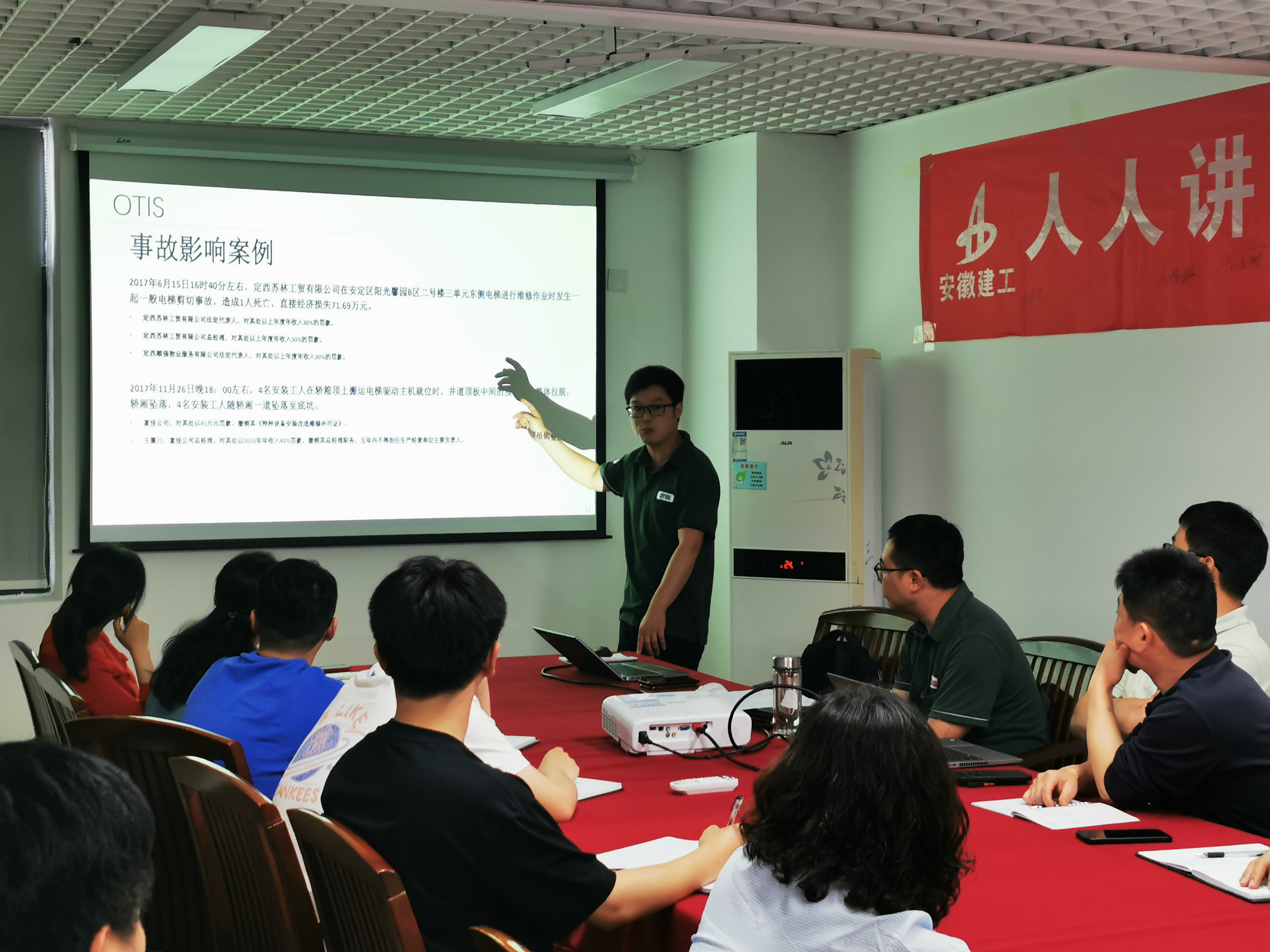 培訓由奧的斯電梯(中國)有限公司安徽分公司安全工程師徐長(cháng)江、項目經(jīng)理張文翔及調試工程師王威為大家授課。三位授課老師結合多年從事電梯行業(yè)的經(jīng)驗,從安全管理責任、安全教育培訓、安全事故案例分析、電梯安裝調試中易錯點(diǎn)及電梯安裝行業(yè)容易導致重傷及死亡事故的原因等方面全面、系統地講解了電梯施工現場(chǎng)容易出現的各類(lèi)安全隱患,深度剖析了隱患可能引發(fā)的各類(lèi)安全事故,各種事故隱患的防護措施及在發(fā)生緊急情況時(shí)如何做好事故處理等。