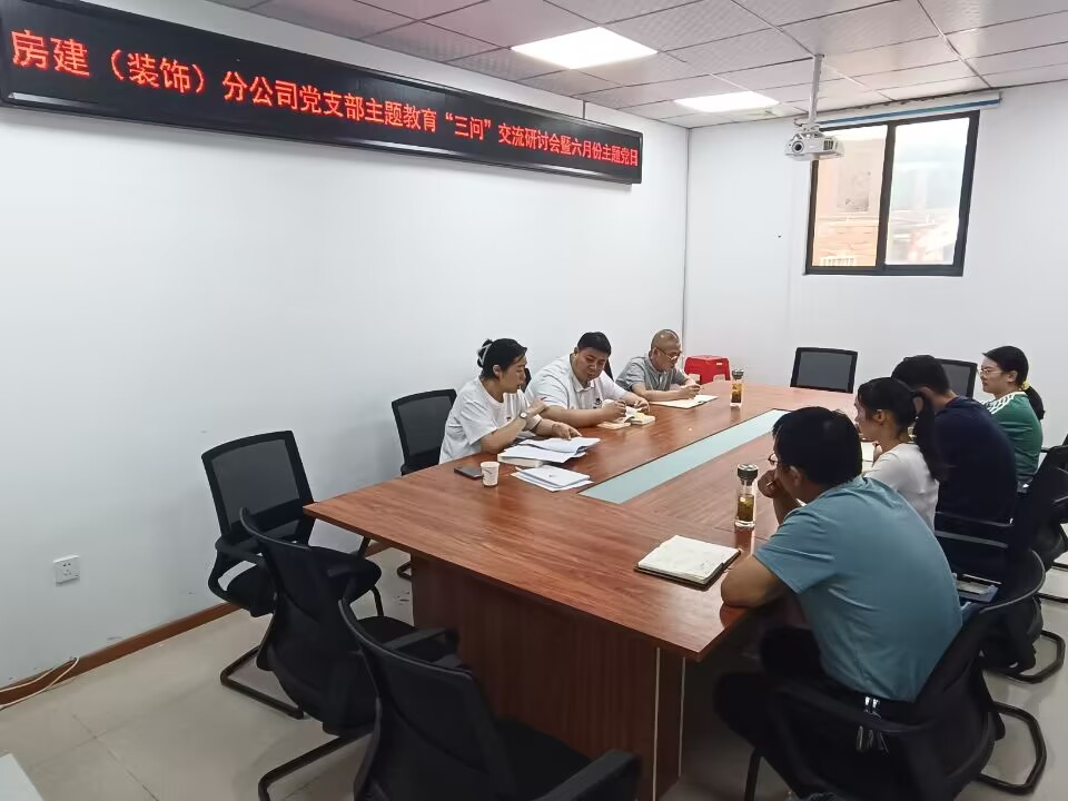 為深入學(xué)習貫徹習近平新時(shí)代中國特色社會(huì )主義思想主題教育,抓實(shí)支部理論學(xué)習,努力在以學(xué)鑄魂、以學(xué)增智、以學(xué)正風(fēng)、以學(xué)促干方面取得實(shí)效。6月16日下午,房建(裝飾)分公司黨支部在會(huì )議室組織召開(kāi)主題教育“三問(wèn)”交流研討會(huì )暨六月份主題黨日活動(dòng)。會(huì )議由支部書(shū)記程茂麗主持,支部全體黨員參加。
