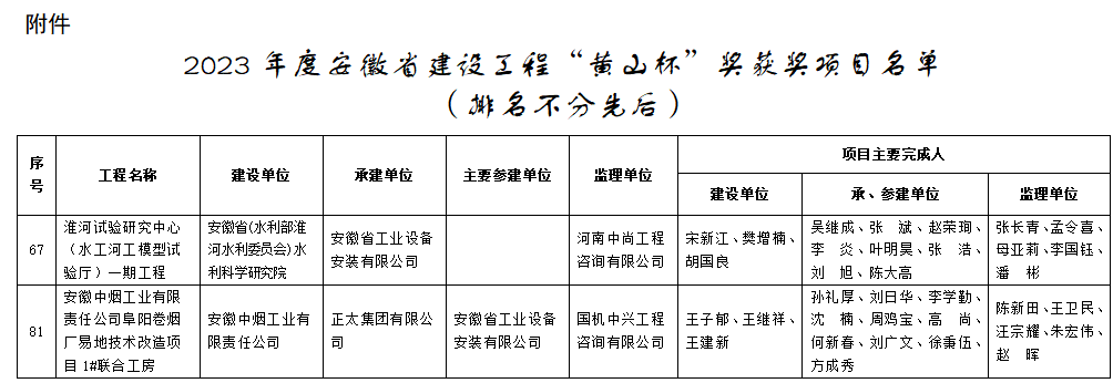 7月25日,安徽省住房和城鄉建設廳 、安徽省交通運輸廳、安徽省水利廳聯(lián)合發(fā)布《關(guān)于公布2023年度安徽省建設工程“黃山杯”獎獲獎項目名單的通知》,由建工安裝集團蚌埠分公司承建的“淮河試驗研究中心(水工河工模型試驗廳)一期工程”和參建的“安徽中煙工業(yè)有限責任公司阜陽(yáng)卷煙廠(chǎng)易地技術(shù)改造項目1#聯(lián)合工房”等2個(gè)項目均獲2023年度安徽省建筑行業(yè)建設工程質(zhì)量最高榮譽(yù)獎“黃山杯”。其中“淮河試驗研究中心(水工河工模型試驗廳)一期工程”是建工安裝公司首次作為承建單位獲此殊榮;“安徽中煙工業(yè)有限責任公司阜陽(yáng)卷煙廠(chǎng)易地技術(shù)改造項目1#聯(lián)合工房”項目同時(shí)正在申報國家級安裝行業(yè)最高獎項中國安裝工程優(yōu)質(zhì)獎(安裝之星),5月份預檢已通過(guò),等待9月復檢。兩個(gè)項目作為承建和參建單位一舉捧得2樽“黃山杯”,也是蚌埠分公司歷史首次,同時(shí)也是蚌埠分公司近年來(lái)捧得的第5、第6樽“黃山杯”獎項。