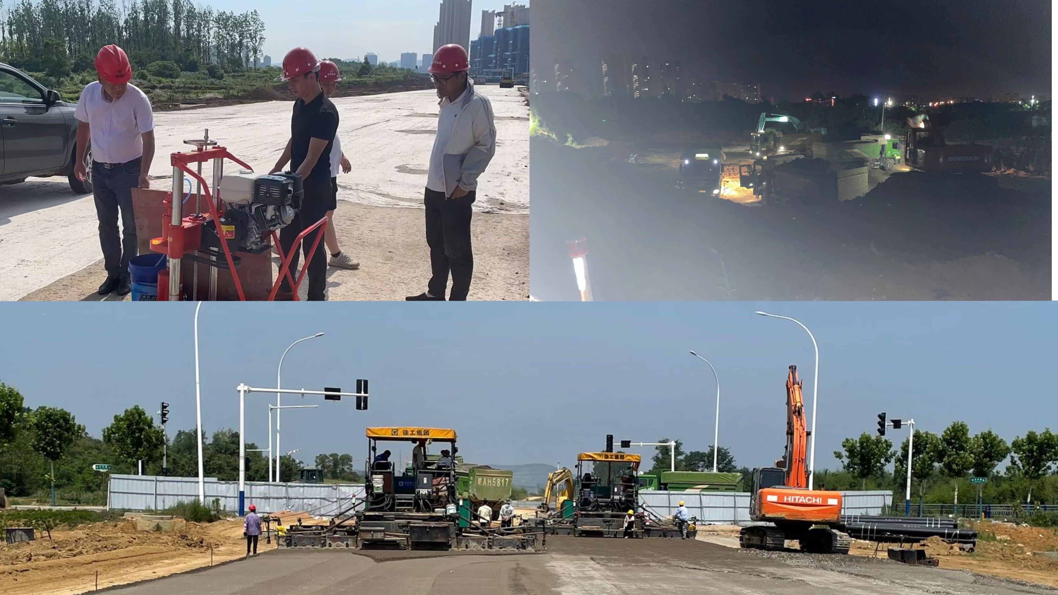 圖為:廬江縣新建立人路(福泉路-城西大道)工程水穩取芯試驗、土方夜間外運及快車(chē)道水穩攤鋪碾壓施工