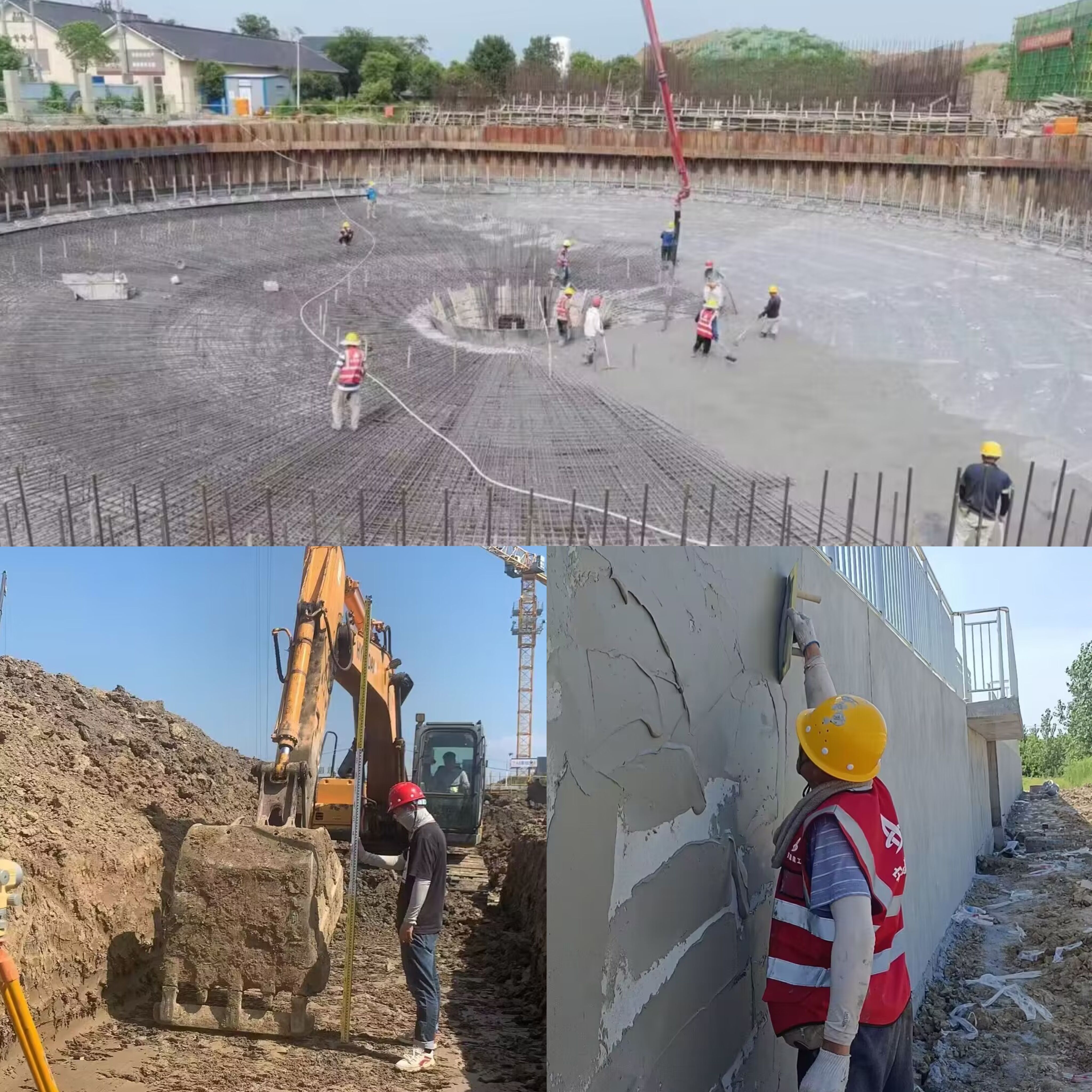 圖為:阜南城南污水處理廠(chǎng)改擴建及配套管網(wǎng)工程二沉池筏板混凝土澆筑、配電房基礎開(kāi)挖及均質(zhì)池外墻粉刷施工