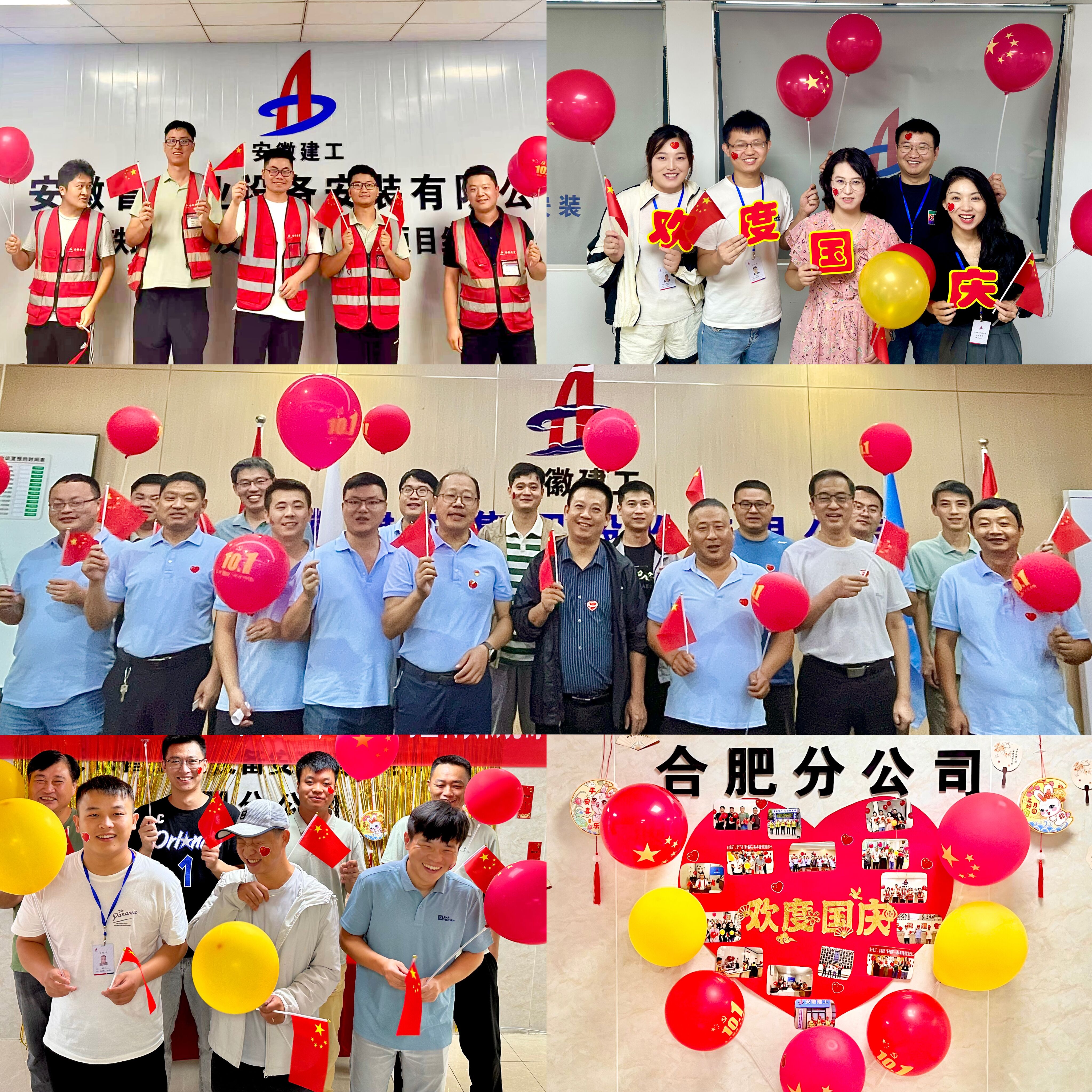 分公司機關(guān)和各項目部人員手持國旗、氣球和祝福標語(yǔ),共同拍攝集體大合照為祖國母親獻上生日祝福,他們臉上的“一抹紅色”在燦爛笑容的映襯下顯得更加明亮耀眼。大家的合照被紅色的“心”連在一起,象征著(zhù)和祖國母親心連心、同歡樂(lè ),共團圓。