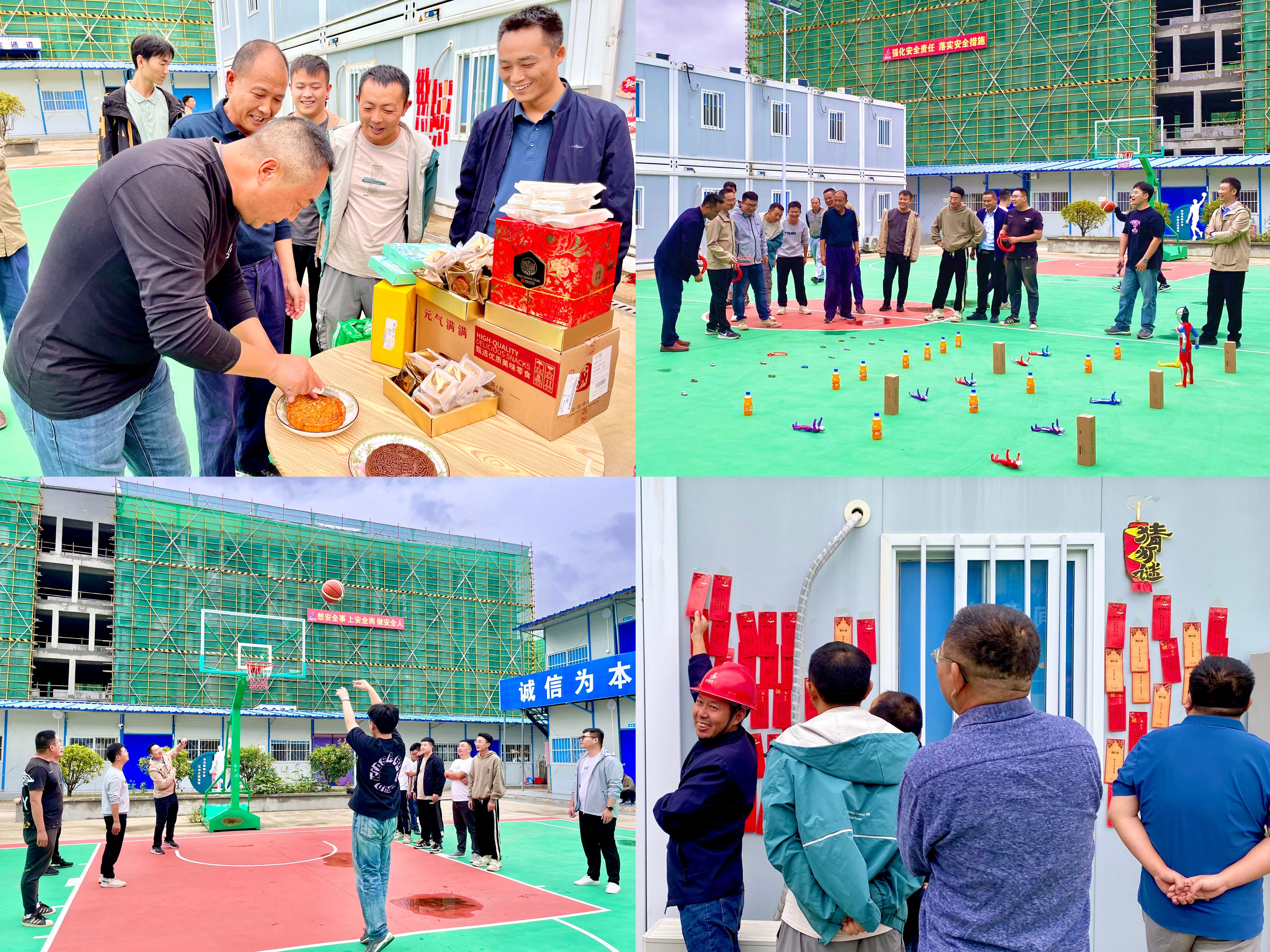 節前,分公司工會(huì )還前往岳西中學(xué)建設項目(一期)安裝專(zhuān)業(yè)分包工程項目部開(kāi)展了雙節慶?;顒?dòng)。在項目現場(chǎng),大家共同分享團圓大月餅,一起品嘗節日“美味”,組織開(kāi)展猜燈謎、趣味套圈、定點(diǎn)投籃等游戲活動(dòng),設置“投籃最佳射手”等獎項。項目部人員熱情踴躍參加,場(chǎng)面熱鬧非凡,爽朗的笑聲回蕩在整個(gè)項目現場(chǎng),在工作之余愉悅身心,緩解工作壓力,同時(shí)也增進(jìn)大家之間的溝通交流,進(jìn)一步增強團隊合作精神和企業(yè)凝聚力、向心力。