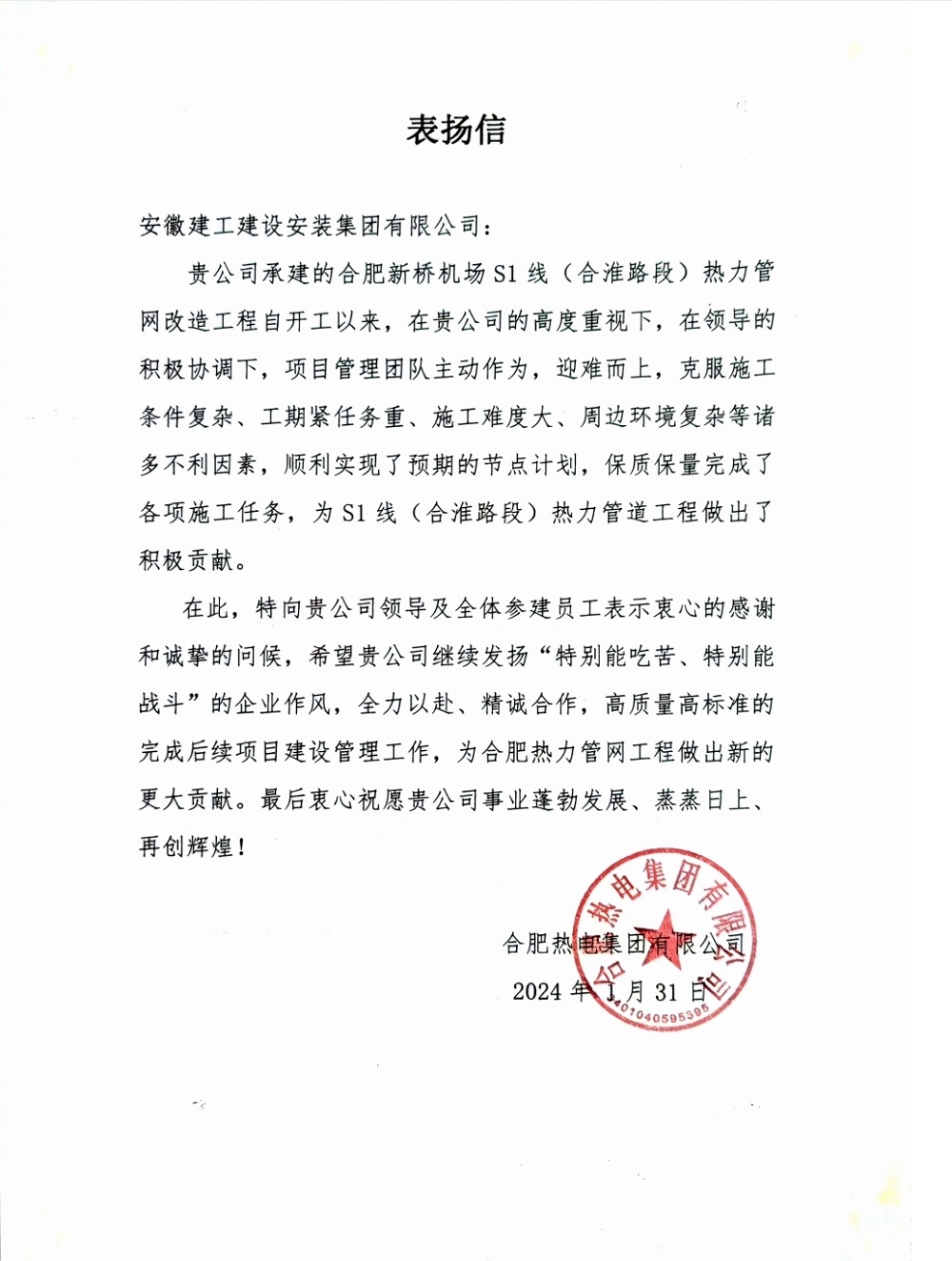 1月31日,合肥熱電集團有限公司發(fā)來(lái)表?yè)P信,就建工安裝集團對合肥新橋機場(chǎng)S1線(xiàn)(合淮路段)熱力管網(wǎng)改造工程做出的積極貢獻予以充分肯定和真摯謝意。