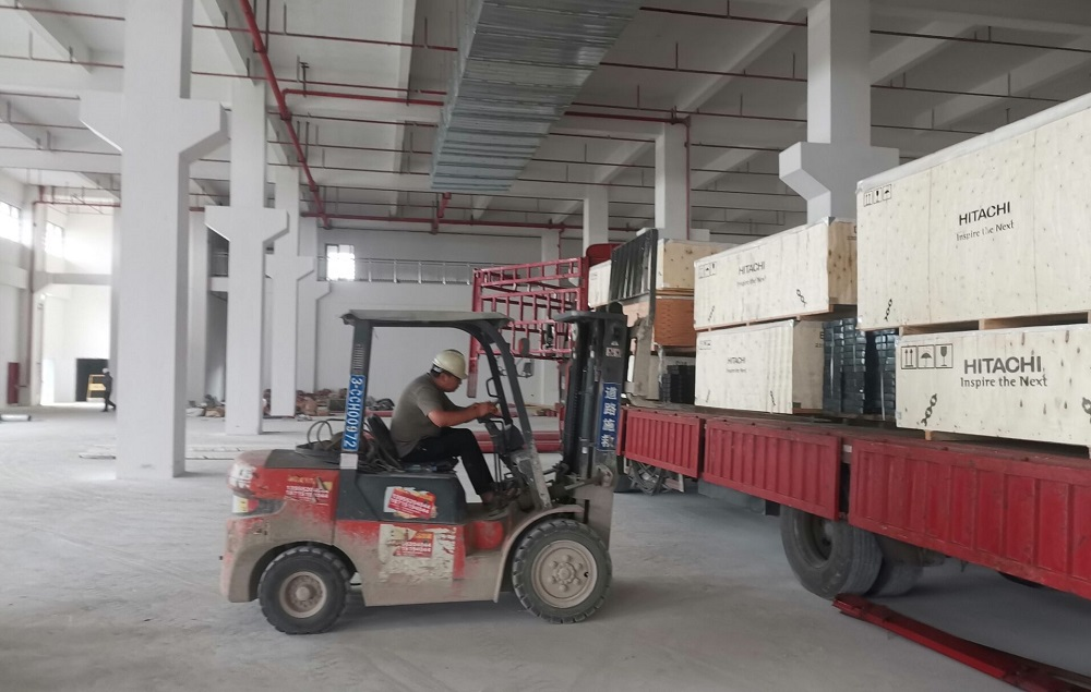 臨港科創(chuàng )園項目現場(chǎng)安裝人員正在進(jìn)行電梯卸貨