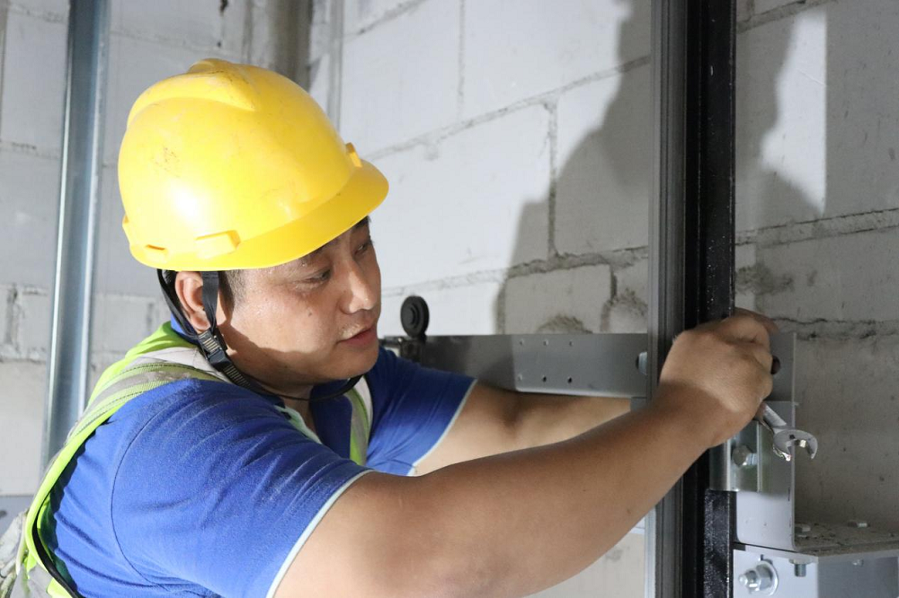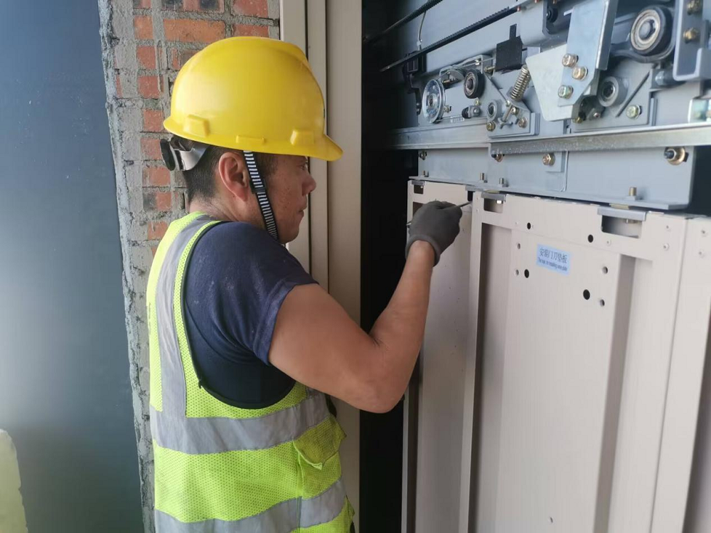 蚌埠傳感谷(寧波蚌埠微電子產(chǎn)業(yè)園一期)項目施工人員正在安裝電梯轎廂門(mén)