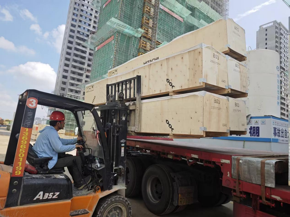 派河印象·杏語(yǔ)林溪項目施工人員正在給到場(chǎng)電梯卸貨