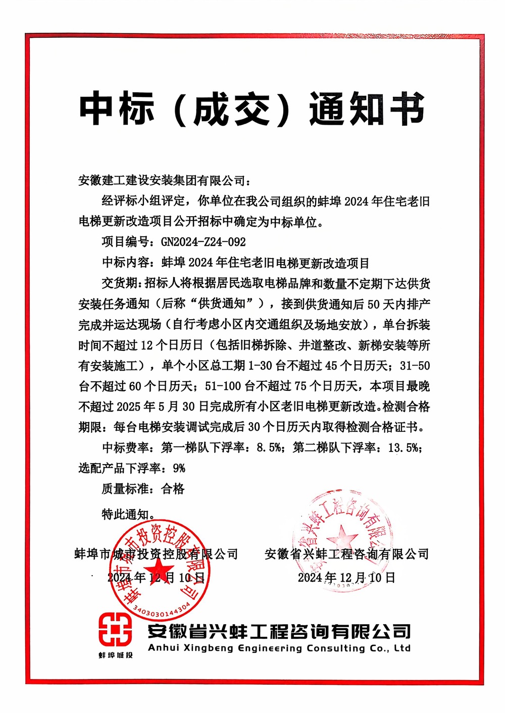 12月10日,建工安裝電梯分公司成功收到蚌埠2024年住宅老舊電梯更新改造項目中標通知書(shū)!