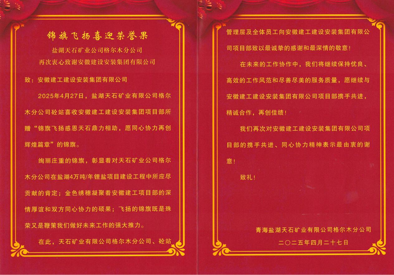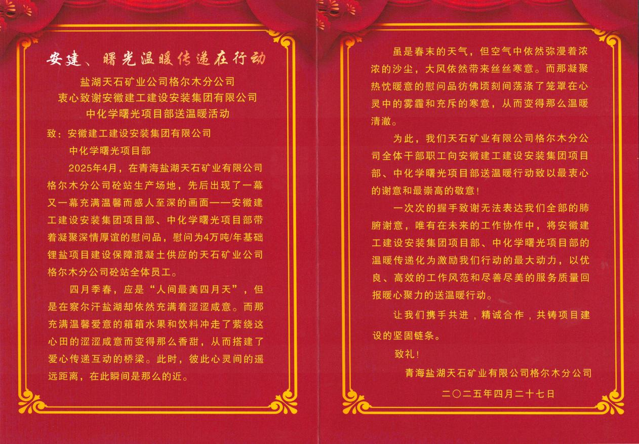 信中,青海鹽湖天石礦業(yè)有限公司格爾木分公司對建工安裝項目部此前慰問(wèn)砼站全體員工致以最誠摯的感謝,愿繼續與建工安裝項目部攜手共進(jìn)、精誠合作、再創(chuàng )佳績(jì)!這封感謝信不僅是對項目部過(guò)往成績(jì)的肯定,更是一份振奮人心的激勵。建工安裝將繼續保持高昂斗志和嚴謹態(tài)度,加強與相關(guān)單位溝通協(xié)作,強化項目管理,確保項目按期、高質(zhì)量交付,為打造世界級鹽湖提鋰產(chǎn)業(yè)基地貢獻力量!